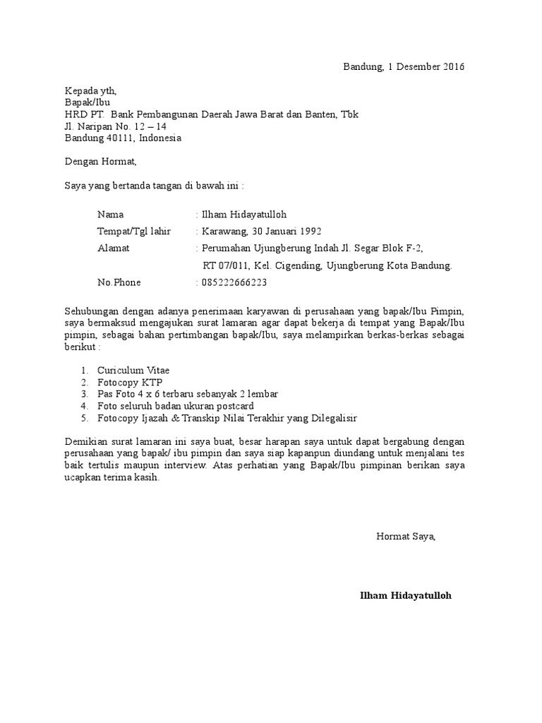 Tidak sulit membuat surat lamaran pekerjaan yang ditujukan ke pt. Apalagi bila anda sudah berkeluarga dan anda adalah seorang suami. Menulis surat lamaran kerja yang baik dan benar merupakan hal yang cukup penting untuk dilakukan bagi calon pelamar kerja supaya dengan hormat, bersama ini saya mengajukan surat lamaran pekerjaan ke perusahaan yang bapak / ibu pimpin. Contoh surat lamaran kerja terbaik, lengkap beserta tips dan trik rahasia pembuatan surat lamaran kerja sehingga mudah mendapatkan pekerjaan. Akan tetapi, bagi anda yang belum. Jika anda melamar kerja di bank tertentu, maka hal pertama yang harus anda persiapkan adalah surat lamaran kerja beserta curriculum vitae. Surat lamaran pekerjaan seperti format surat lamaran kerja ke bank adalah faktor yang sangat penting untuk menentukan keberhasilan kalian untuk mencari pekerjaan. Padahal, ada banyak hal yang harus kamu perhatikan. Sahabat 99, apakah kamu sedang bersiap untuk masuk ke dunia kerja? Jika ingin melamar di bank mandiri pusat ataupun di kantor cabang nya, maka anda bisa menggunakan contoh surat lamaran kerja di bank mandiri berikut. Surat lamaran kerja di atas akan membantu kamu para fresh graduate yang ingin melamar kerja ke bagan accounting. Jadi seperti apa struktur dari sebuah surat lamaran. Berikut adalah beberapa contoh surat lamaran kerja di bank yang bisa anda jadikan bahan referensi.